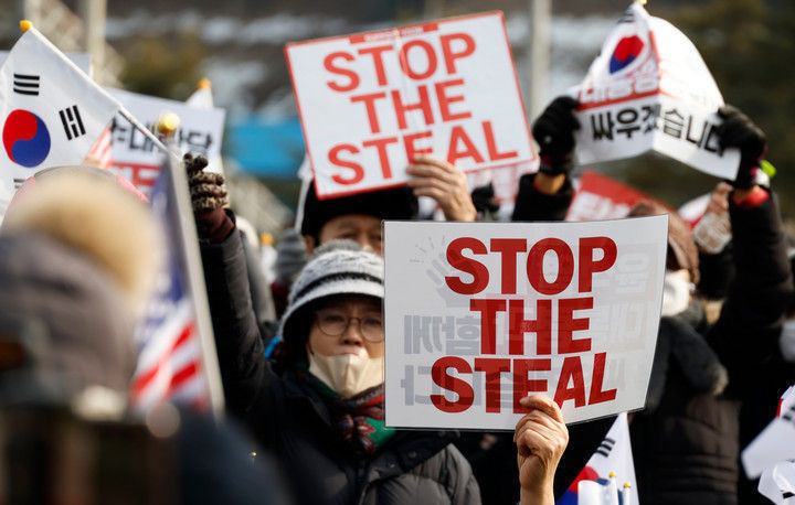 1月16日,尹锡悦的支持者在尹锡悦所处的韩国首尔拘留所外抗议。新华社发(全休相摄)